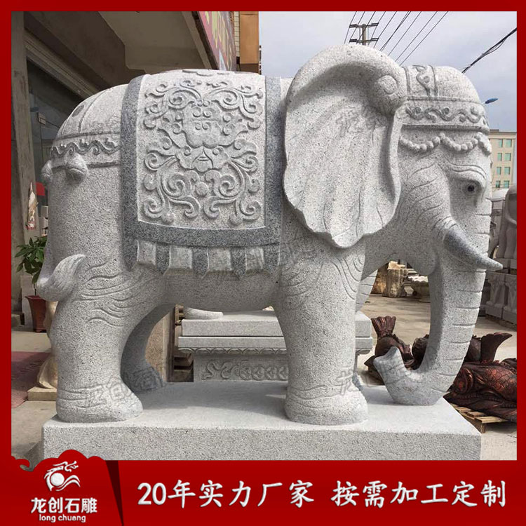 石雕大象造型各異,從鼻子來看,就有分鼻子朝上、鼻子朝下、鼻子朝內、鼻子朝外。象諧“祥”音,所以常有吉象之稱,適合擺放在酒店別墅、企業、寺廟門口等各種場景。